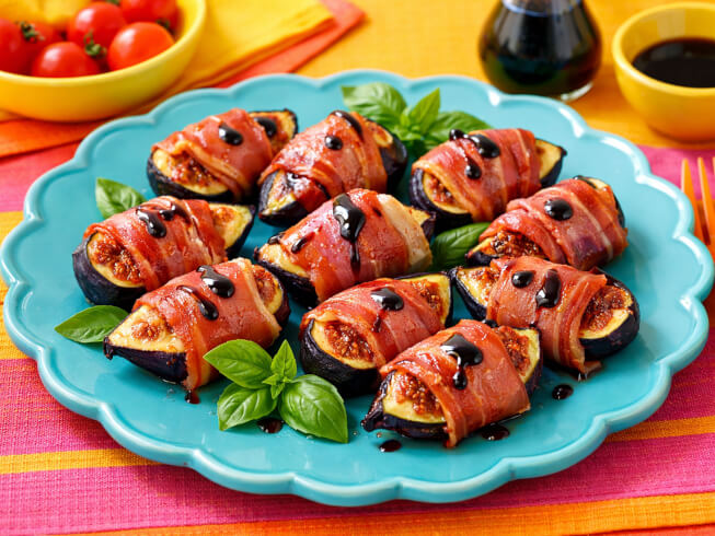 Cut the figs in half lengthwise. Wrap a piece of prosciutto completely around each fig half. Place the figs on a baking sheet. Bake 10 minutes or until heated through.