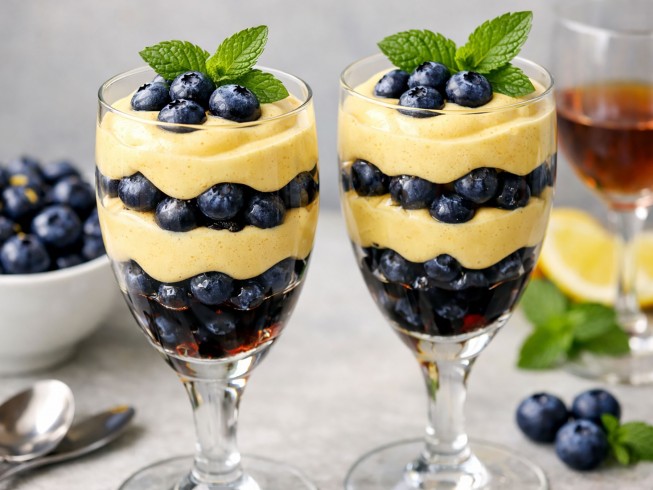 Spoon a portion of the blueberries into a wineglass or champagne flute and top with a spoonful of the sabayon. Repeat to form two layers. Garnish with mint and serve immediately.