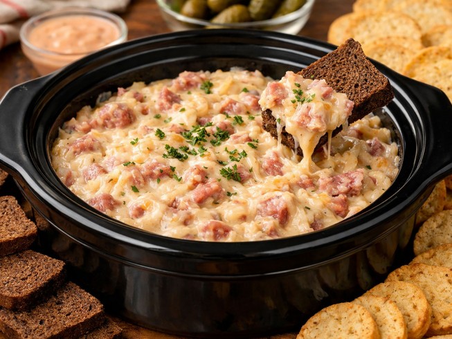 Reuben dip is a warm, cheesy appetizer inspired by the classic Reuben sandwich. It typically combines corned beef, sauerkraut, Swiss cheese, and Thousand Island dressing.