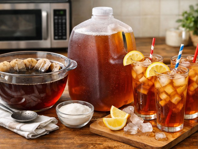 Remove tea bags and add sugar to taste (same as regular tea). Pour into one gallon container and add hot water. Let cool. Serve over ice in glasses.