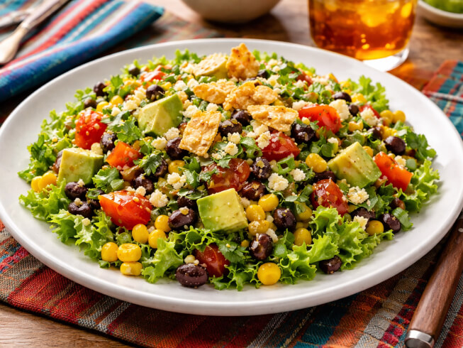 A quick and easy salad loaded with corn, beans, and colorful vegetables. Tossed with a simple lime and adobo dressing, this dish is ready in minutes. Perfect for a refreshing weeknight meal.